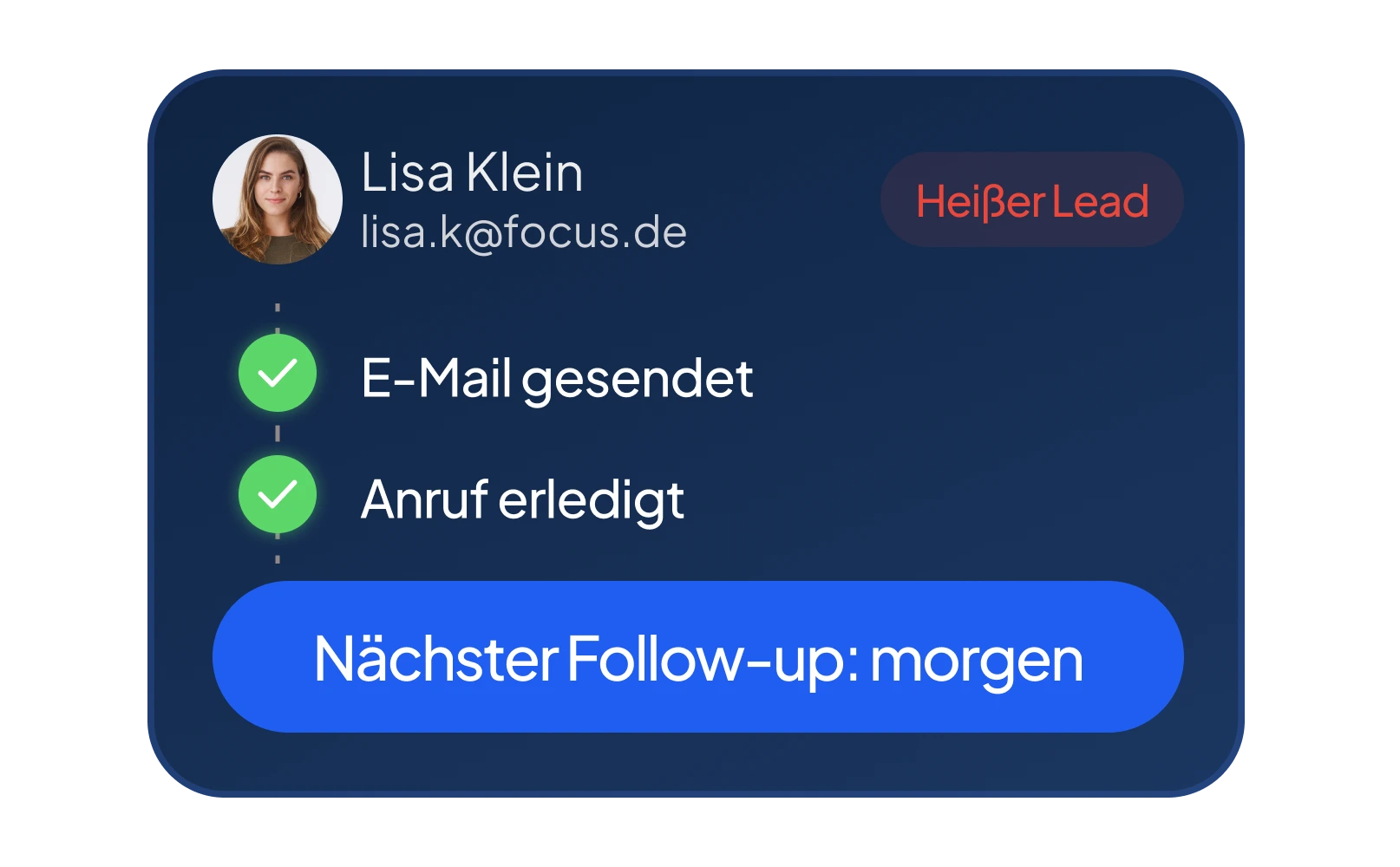 Kein Lead geht verloren. Das System erinnert automatisch an offene Kontakte und stellt sicher, dass jeder Interessent zur richtigen Zeit wieder erreicht wird.