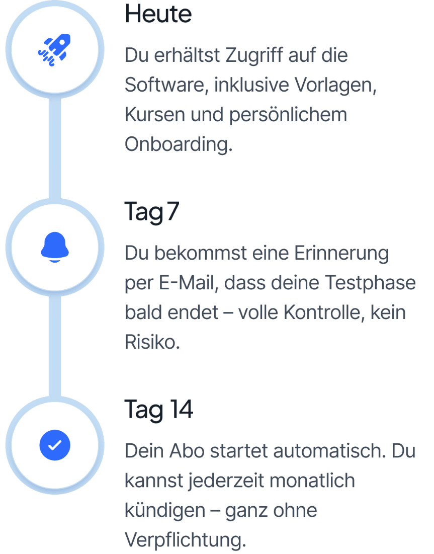 In der Regel weniger als 30 Minuten. Du bekommst sofort Zugang zu Vorlagen, Schritt-für-Schritt-Anleitungen und persönlicher Unterstützung. Wir haben extra Vorlagen entwickelt, die du direkt nach der Kontoerstellung auswählen kannst. Im 1:1 Onboarding setzen wir gemeinsam schon vieles für dich auf – damit du schnell startklar bist.