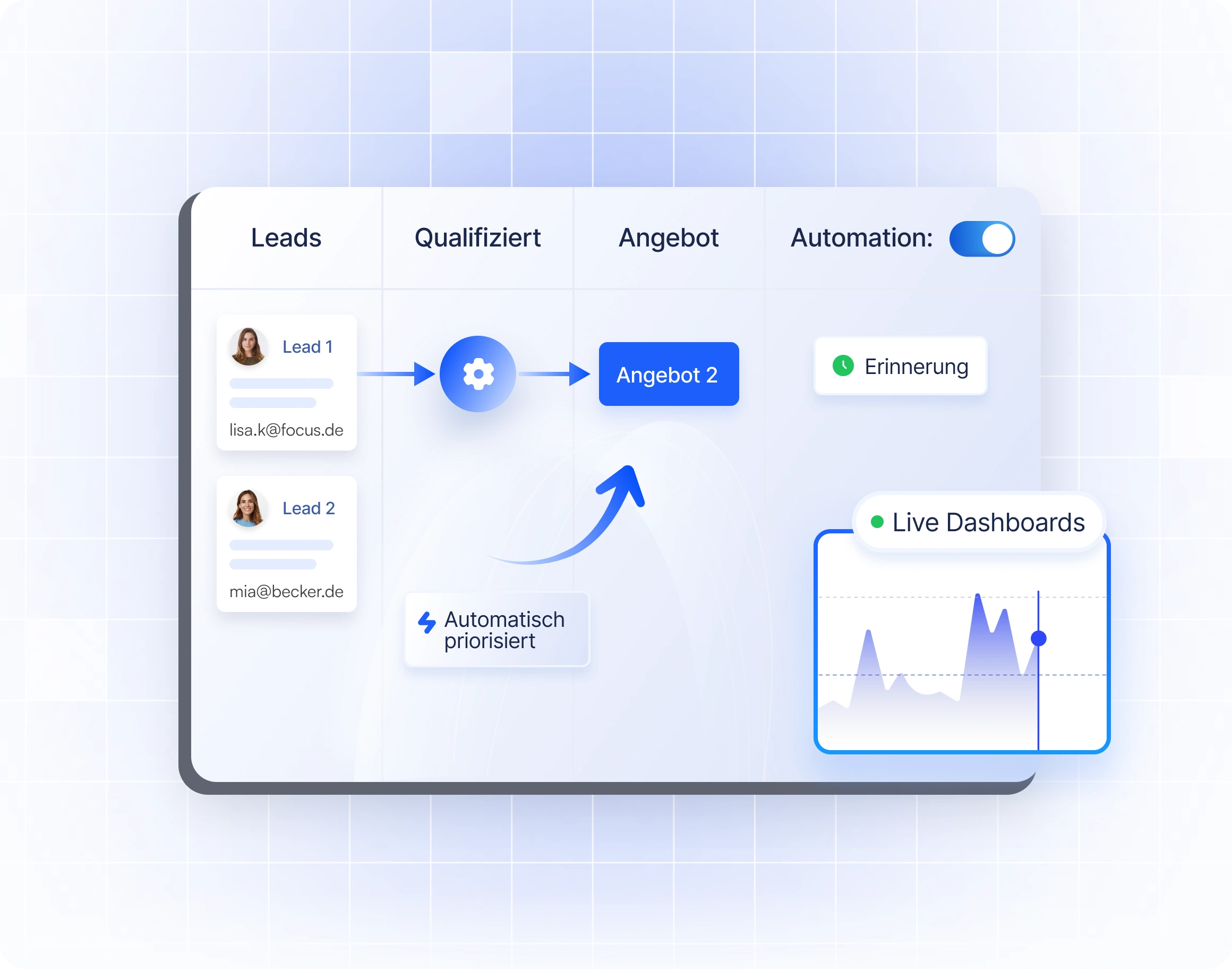 Klare Phasen, smarte Wiedervorlagen, Priorisierung und Live-Dashboards – volle Transparenz in Echtzeit.